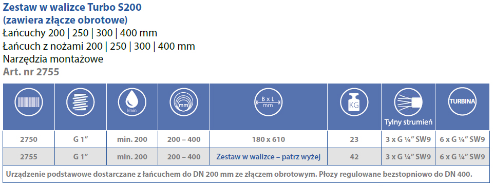 Turbo S200 to wysokowydajna wycinarka z powiększoną turbiną do usuwania mocno wrośniętych korzeni i stwardniałych osadów. Kompaktowa konstrukcja umożliwia zastosowanie w kanałach o niewielkiej średnicy. System szybkiej wymiany łańcucha maksymalnie zwiększa wydajność. Wycinarka jest w 100% odpowiednia do pracy z wodą z recyklingu.